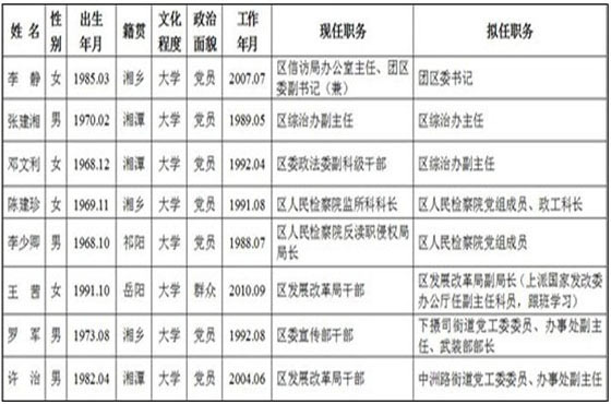 资料图片:根据湖南省湘潭市岳塘区4月18日发布的干部任前公示,一位名为“王茜”的20岁女生将被提拔为该区发展改革局副局长,并将“上派到国家发改委办公厅任副主任科员,跟班学习”。据公示资料,该女生18岁即参加工作,文化程度为大学,按资料推算应系14岁或者15岁上大学。此外,该女的政治面貌系“群众”而非“党员”。