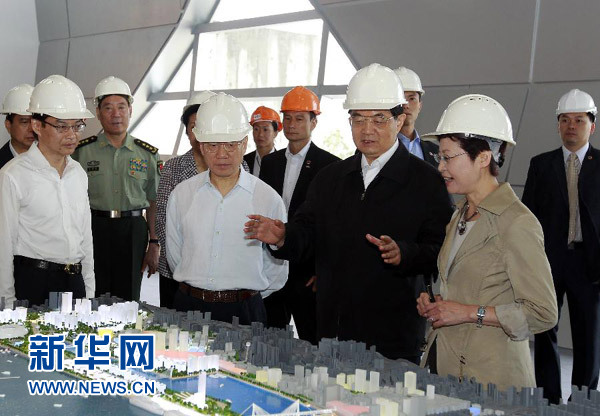 6月30日,国家主席胡锦涛在香港视察启德发展计划。这是胡锦涛主席在听取关于项目建设的介绍。 新华社记者 鞠鹏 摄