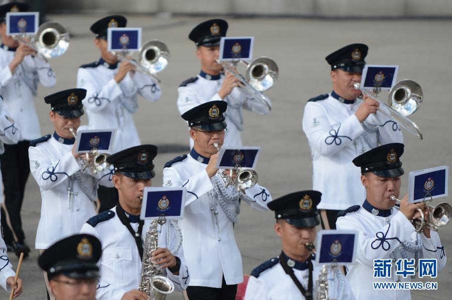 7月1日,香港警察乐队在升旗仪式前列队行进。当日,香港金紫荆广场举行升旗仪式,庆祝香港回归祖国十五周年。新华社记者张金加摄