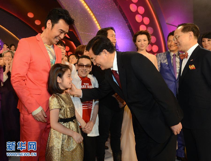 6月30日,国家主席胡锦涛在香港会展中心出席庆祝香港回归祖国15周年文艺晚会。这是演出结束后,胡锦涛等向演员祝贺演出成功。新华社记者刘建生摄