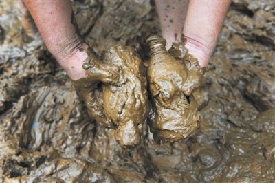 村诊所的医生在淤泥里寻找药品。