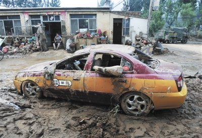 村里,一辆出租车被洪水从高处冲下来。