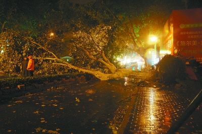 8月8日晚,园林工人在处置被刮倒的行道树 吴明亮 摄