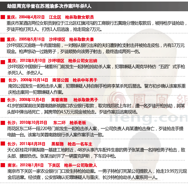 8月10日9时34分,重庆市沙坪坝区凤鸣山康居苑中国银行储蓄所门前发生一起持枪抢劫杀人案,案犯打死1人、打伤2人后逃逸。经查,该案与2004年以来发生在江苏南京、湖南长沙、重庆等地的多起持枪抢劫杀人案系同一犯罪嫌疑人周克华所为。周克华,男,汉族,1970年2月6日出生,系重庆市沙坪坝区井口镇二塘村人。