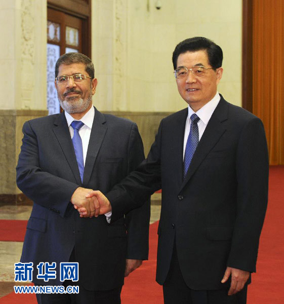 国家主席胡锦涛28日下午在人民大会堂同埃及总统穆罕默德·穆尔西举行会谈,双方就双边关系及共同关心的国际和地区问题深入交换意见,达成广泛共识。两国领导人一致同意,秉承友好传统,加强全方位合作,推动中埃战略合作关系迈上新台阶。