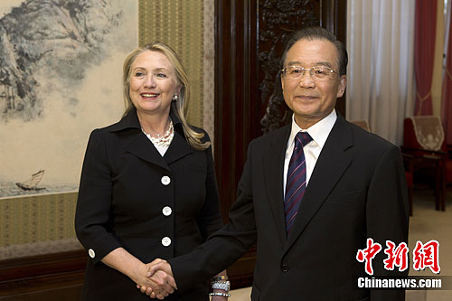 9月5日,中国国务院总理温家宝在北京中南海紫光阁会见美国国务卿希拉里·克林顿。中新社发 盛佳鹏 摄