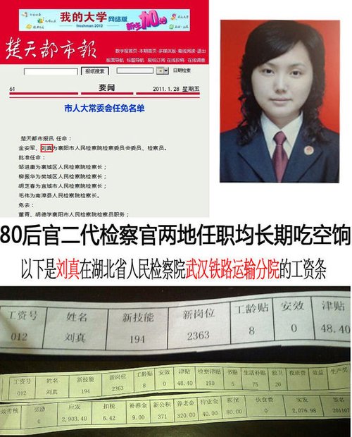 9月10日,一条“80后官二代刘真在武汉、襄阳两地检察院任职,均不上班吃空饷”的微博引起社会各界关注。微博称,刘真系武汉大学法学院12届博士研究生,但在2008年8月就已经担任武汉铁路检察院助理检察员,半年后脱产读博至今未上班。2011年襄阳市人大又任命其为检察委员会委员(副处级),但也从未上过班,两地均长期吃空饷。