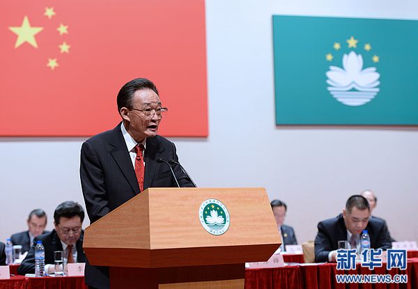 2月21日,澳门社会各界纪念澳门基本法颁布20周年启动大会在澳门文化中心举行,中国全国人大常委会委员长吴邦国出席大会并发表讲话。新华社记者 马占成 摄
