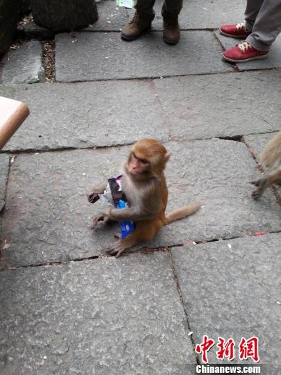 2013年4月,庐山仙人洞景区数十只猕猴好不怯生向游客讨要食物,更有调皮者直接抢夺游客手中的饼干、花生,不少女性游客被惊吓。图为一直小猴抱着从游客手中抢走的饼干。王剑摄