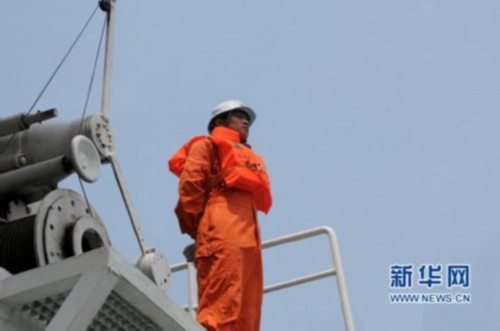 图为“北海救203”轮上两个80后水手在甲板上作业 新华网记者 袁晗摄
