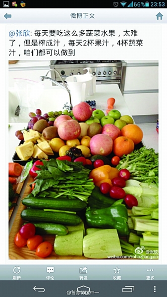 @张欣(潘石屹妻子):每天吃这么多水果蔬菜太难,但是榨成汁,每天2杯果汁,4杯蔬菜汁,咱们都可以做到。