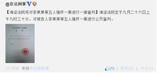 据北京法院网官方微博“京法网事”消息,海淀法院定于9月26日上午9时30分,对被告人李某某等五人强奸一案进行公开宣判。