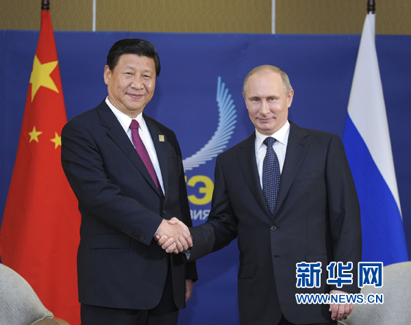 普京表示,很高兴今天同习近平主席见面,就两国关系未来发展交换意见。当前,俄中关系发展很好,双方领导人交往频繁,经贸、两军、人文等领域交往合作不断加强,在重大国际和地区问题上有效协作。俄方高兴地看到,俄罗斯中国旅游年活动丰富多彩。展望未来,俄中关系发展前景广阔。我愿同习近平主席继续保持亲密友谊和密切交往,进一步推动各领域务实合作,实施好能源、基础设施建设等重大合作项目,加强在国际事务中的沟通和协调。