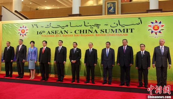 10月9日,中国国务院总理李克强在文莱首都斯里巴加湾出席第16次中国—东盟(10+1)领导人会议。图为李克强总理(左5)与东盟各国领导人在会议开始前集体合影。李克强9日下午乘专机抵达文莱,出席第16次中国—东盟(10+1)领导人会议、第16次东盟与中日韩(10+3)领导人会议和第八届东亚峰会,并对文莱进行正式访问。中新社发 张明 摄