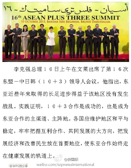 据新华社“新国际”微博报道,李克强总理10日上午在文莱出席了第16次东盟-中日韩(10+3)领导人会议。他指出,东亚近些年来取得的长足进步得益于该地区没有发生战乱。实践证明,10+3合作是成功的,也是成为东亚合作的主渠道、主阵地。详见长微博。