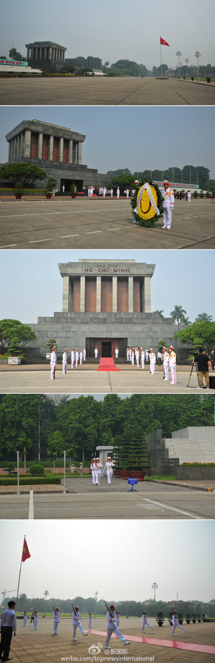 据新华社“新国际”微博报道,正在越南访问的国务院总理李克强14日上午向位于河内市中心巴亭广场中央的胡志明陵敬献花圈。下面组图为李总理抵达前,越方工作人员和仪仗队在纪念陵前准备迎接的情况。