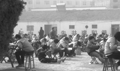 距台前县政府1公里之遥的城镇中学,由于教室不充裕,学生在室外空地上考试。网络截图