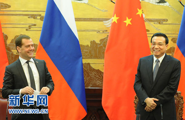 李克强介绍了中俄总理第十八次定期会晤达成的共识和成果。他说,中俄之间的合作是两个最大邻国之间的合作,是两个安理会常任理事国之间的合作,是两个主要新兴市场国家之间的合作,对两国、欧亚大陆乃至世界的意义都不言而喻。中方愿与俄方携手努力,挖掘潜力,创新方式,推动两国战略合作取得更多新成果。李克强赞赏中俄不久前为抗击黑龙江流域洪涝灾害开展的紧密合作和相互帮助,认为这充分体现了两国的战略合作和深厚友谊。