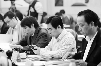 新闻发布会现场,“网络大V”边提问边发微博。记者金振强 摄