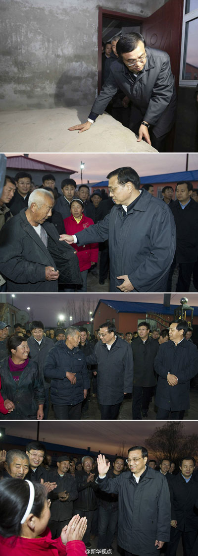 据新华社“新华视点”微博报道,天色渐晚,李克强来到银川乡幸福大院安置点,这里刚为受灾特困户和五保户建起安置房。李克强说,黑龙江冬天冰天雪地,最怕冷。政府要安置好困难群众,让大家有地方住,温暖过冬。冬天过暖和了,来年也一定有好春天,一定有好日子。