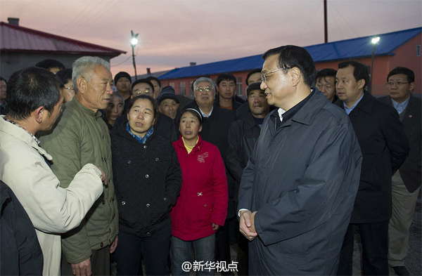 据新华社“新华视点”微博报道,李克强4日来到同江银川乡幸福大院。这里是五保户和特困户安置点。在符合购买幸福大院住房条件公式栏下,李克强帮患病特困户邢方才查询,邢方才高兴地告诉总理自己榜上有名。幸福大院10月6日开工,建有8栋32户平房,己基本完工通暖,可让当地五保户和贫困户温暖过冬。