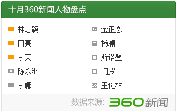 据360新闻数据显示,在2013年10月最受关注的十大新闻人物中,林志颖和田亮因在湖南卫视综艺节目《爸爸去哪儿》中的表现分列榜单前两位。李天一本月排名与上月持平,仍为第三。其他入选的还有收受钱财发布重大失实报道的记者陈永洲、亚洲首位世界排名前三的女网选手李娜、以新发型亮相的金正恩、因“杨澜体”提问而被误解的杨澜、写信请求美国宽恕遭拒的斯诺登、2013年诺贝尔文学奖得主门罗、成为福布斯中国富豪榜和胡润中国富豪榜双料魁首的王健林。