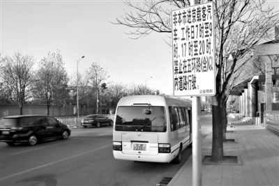 昨日,北京祈年大街上的外地车禁行时段标示牌。从11月起,北京对外地车闯高峰限行采取罚100元扣3分的处罚。新京报记者 王贵彬 摄