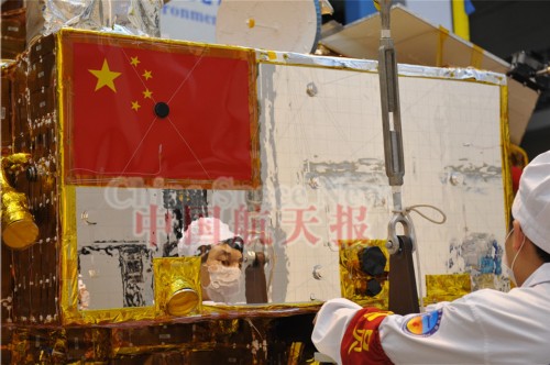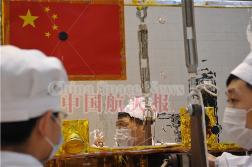 图为2013年4月,在北京唐家岭的五院卫星总装试验大厅(简称AIT大厅)内,五院总装与环境工程部的试验人员们正在进行嫦娥三号探测器的热试验准备工作,通过本次试验来最终确认其能否忍受在奔月、落月过程中所要承受的严峻考验。(资料图)图片来源:中国航天报