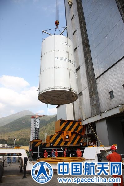 在发射试验队员的精心护送下,近日,嫦娥三号探测器顺利完成转场工作。日前,长征三号乙火箭与嫦娥三号发射试验队正在厉兵秣马,全力以赴做好各项发射前的准备工作。图为吊装嫦娥三号。图片来源:中国航天网