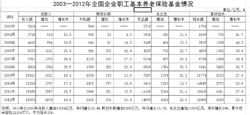 2012年比2003年总收入增加15154亿元,年均增长21.4%;财政补助增加1885亿元,年均增长18.1%;总支出增加11293亿元,年均增长20%;累计结余增加21204亿元,年均增长33%。
