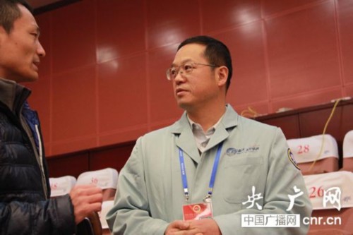 记者白宇在北京飞控中心采访嫦娥三号任务测控系统专家宋军(右) 央广网记者朱虹 摄