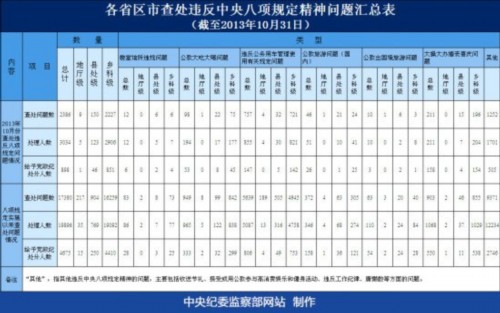 中新网12月2日电 据中央纪委监察部网站消息,中央纪委发布2013年10月各省区市查处违反中央八项规定精神问题汇总情况。