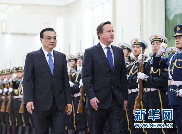 12月2日,中国国务院总理李克强在北京人民大会堂北大厅举行欢迎仪式,欢迎来华进行正式访问并出席中英总理年度会晤的英国首相卡梅伦。新华社记者 王晔 摄