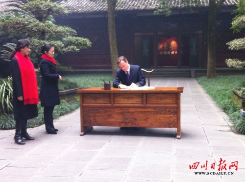 卡梅伦访问成都:参观杜甫草堂 吃火锅