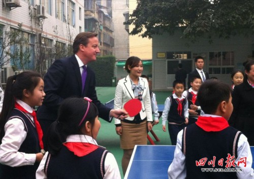 卡梅伦到成都龙江路小学分校参观并和小学生打乒乓球(四川日报网记者 刘淼淼/摄)