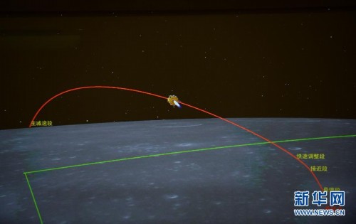 12月14日,嫦娥三号开始落月。探测器从距月面15公里处实施动力下降,相对速度将从每秒1.7公里逐渐减为0。这是北京飞行控制中心大屏幕上显示的嫦娥三号探测器。新华社记者 李鑫 摄