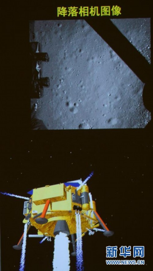 12月14日,嫦娥三号平稳落月,中国首次地外天体软着陆成功。这是北京飞行控制中心大屏幕上显示的嫦娥三号探测器和降落相机图像。新华社记者 李鑫 摄