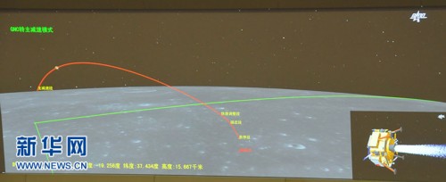 飞控中心大屏幕上正在模拟显示嫦娥三号动力下降高度曲线 石乐乐 摄
