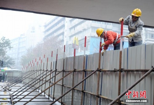 12月28日,四川泸州商场天然气泄漏爆燃事故调查工作全面开展,事发现场的道路交通已恢复,但受事故影响的附近天然气还未恢复。图为两名工作人员正在将围栏上刷上安全警示红白标志。刘忠俊 摄