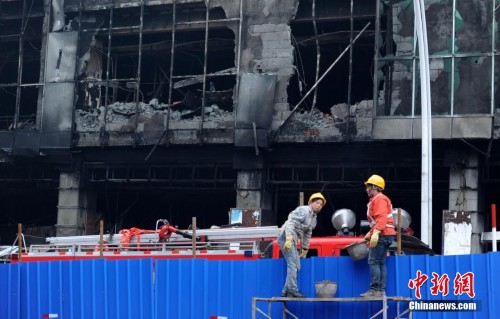 12月28日,四川泸州商场天然气泄漏爆燃事故调查工作全面开展,事发现场的道路交通已恢复,但受事故影响的附近天然气还未恢复。图为两名工人正在商场外紧张忙碌。刘忠俊 摄
