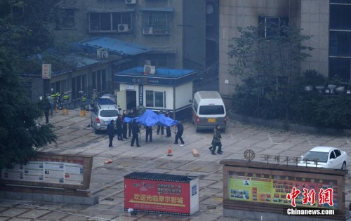 12月28日,四川泸州商场天然气泄漏爆燃事故调查工作全面开展,事发现场的道路交通已恢复,但受事故影响的附近天然气还未恢复。图为几名警察正在平台上搭建工作帐篷。刘忠俊 摄
