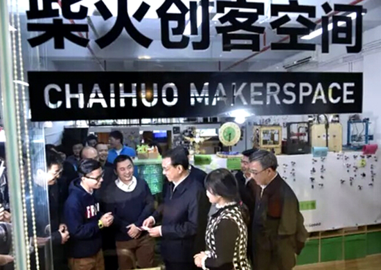 2015年1月4日,李克强在考察深圳柴火创客空间(中新社记者刘震摄)
