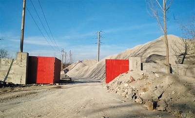 2015年12月29日晚8时许,在矿山路尚庄子村,两三个足球场大小的存料场内机器轰鸣,一台两米多高的粉石机正在粉碎石料。