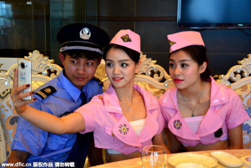 这些身穿城管制服的吃饭者和8名靓丽“空姐”服务员,则是其花钱雇请的临时演员。