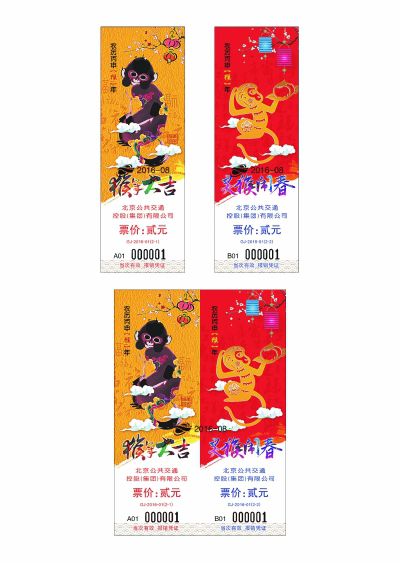 农历猴年新春到来之际,公交集团于2月1日首班车开始,发行2016年猴年生肖春节纪念车票。纪念车票一套2张,以“猴年大吉”和“灵猴闹春”为主题,每张票价2元,在北京公交集团所属有人售票线路上发售。车票与日常公交车普票购买方法一致,乘客上车时按照所乘线路现行票制票价购票,当日当次车有效。持“一卡通”IC卡乘车的乘客与日常刷卡乘车方式一致。纪念票数量有限,售完为止。
