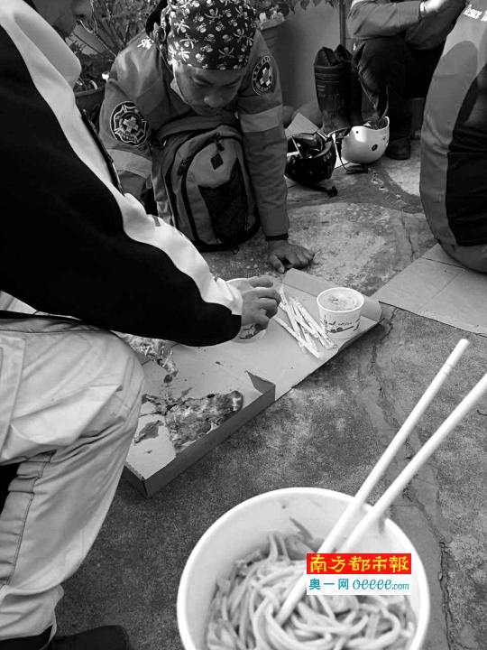 台南维冠金龙大楼的搜救工作人员正在吃“年夜饭”。 受访者供图