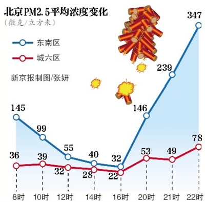 近年除夕夜全市PM2.5短时燃放峰值都在400微克/立方米左右,年际变化差异不大。燃放过后,如遇到有利的扩散形势,烟花燃放的污染物将会被快速清 除,例如2013年除夕至初一,当时除夕空气质量达到五级重度污染,不过初一改善至二级良好水平。如果遇到不利的污染扩散形势,燃放过后仍有可能维持在较 高浓度水平,并导致初一的空气质量进一步转差,例如2015年除夕当天空气质量整体为二级良,不过初一空气质量转差至五级重度污染。