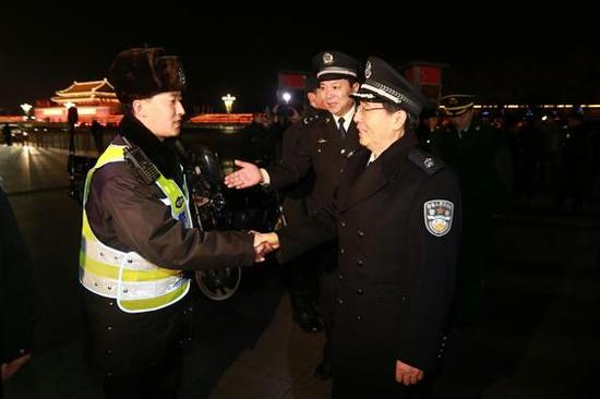 2月7日晚,国务委员、公安部部长郭声琨深入北京基层公安所队和街面执勤岗,实地检查春节安保工作。图为郭声琨在国家博物馆北门执勤岗亲切慰问执勤交警。