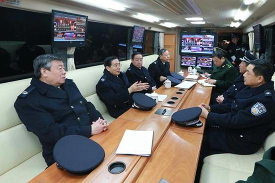 2月7日晚,国务委员、公安部部长郭声琨深入北京基层公安所队和街面执勤岗,实地检查春节安保工作。图为郭声琨在街面消防指挥车上详细询问接处警情况。