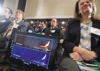 在美国首都华盛顿举行的新闻发布会上,屏幕上显示出探测到的引力波。图/CFP